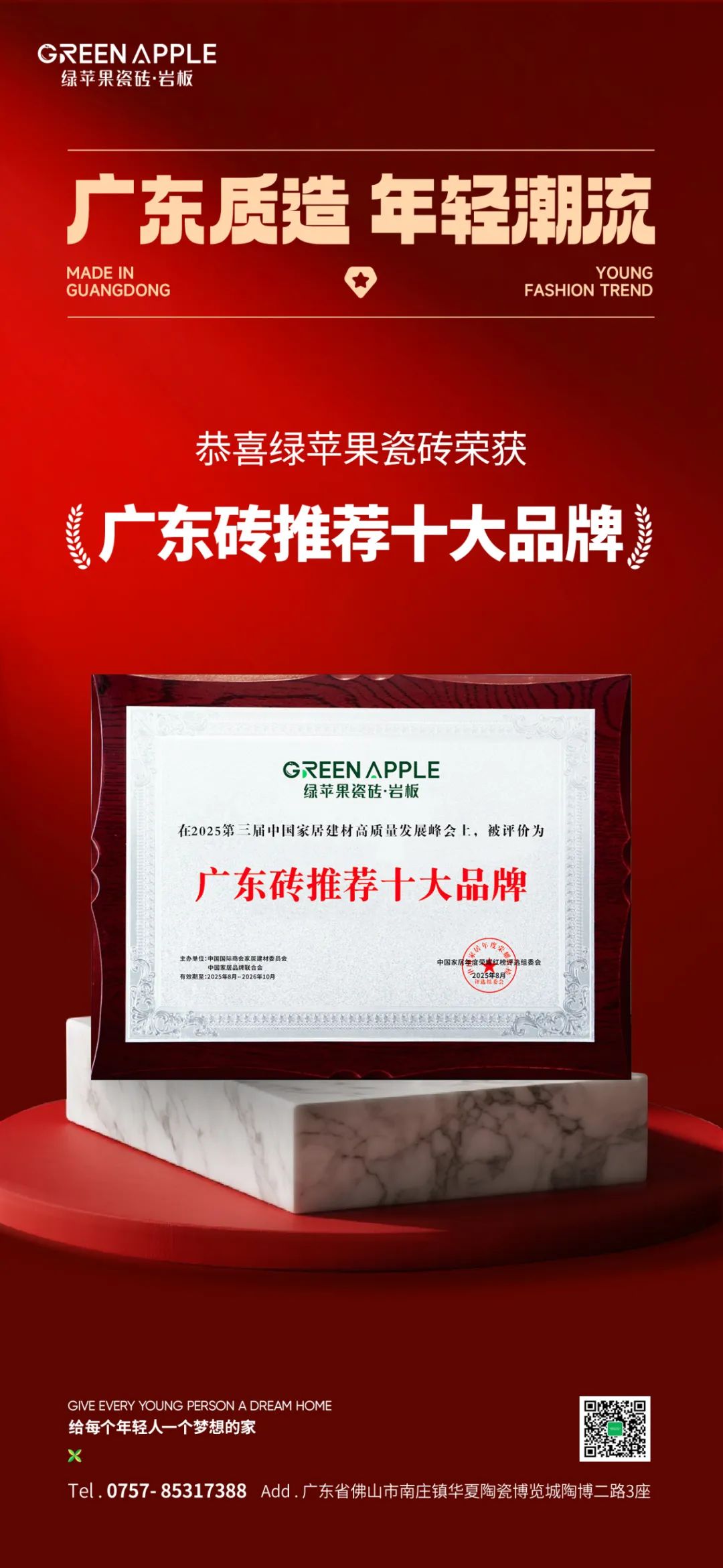 展望未來,綠蘋果將以榮譽為起點,深化產品創新+渠道升級雙輪驅動戰略,持續輸出代表“廣東制造”水準的創新產品,加速布局年輕化營銷渠道,讓更多消費者體驗到“廣東磚”的品質魅力,在推動區域品牌升級的道路上,以實際行動詮釋“廣東磚”的時代內涵,樹立高質量標桿典范。